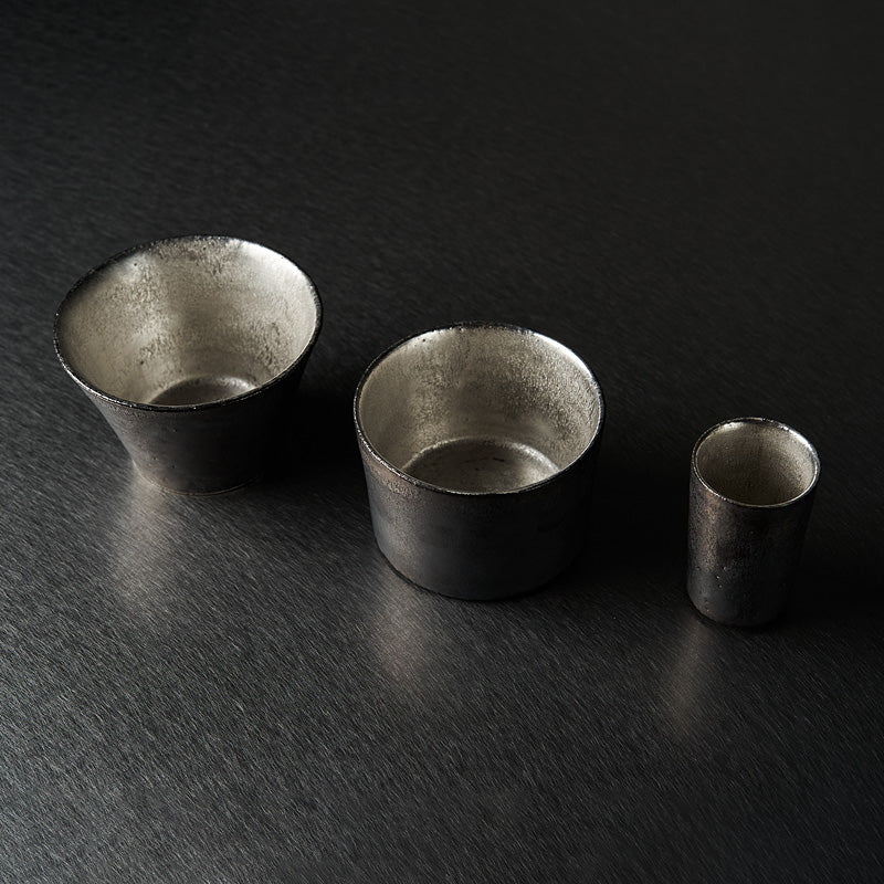 無駄を削ぎ落としたシンプルでストイックな形でありつつ、白釉、鉄釉、銀彩、貫入などを用いてさまざまな表情の作品を生み出す、笠間の陶芸家、船串篤司氏の作品。